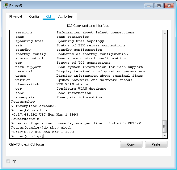 Seperti yang kalian lihat diatas adalah perintah yang dapat di kombinasikan dengan show. Sebagai contoh saya akan coba untuk melihat Jam yang ada di Router tsb. Dengan menggunakan perintah show clock.